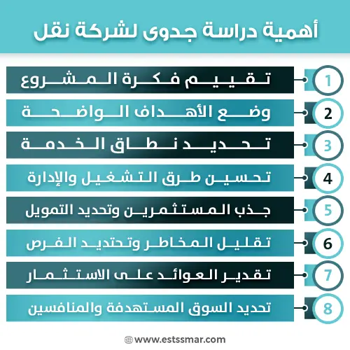 تعمل دراسة جدوى لشركة نقل على تقديم البيانات والمعلومات التي تساهم في تقييم فكرة المشروع وتحديد جدواها المالية والاقتصادية حتى يتمكن المستثمر من اتخاذ القرارات السليمة تجاه المشروع.