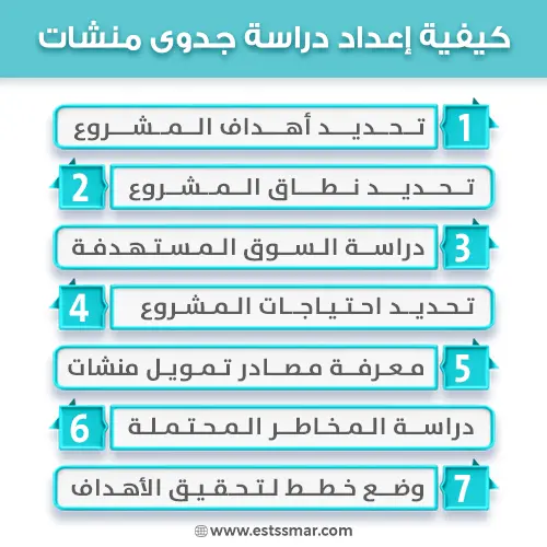 إعداد دراسة جدوى منشات يتطلب مجموعة من الخطوات التي يتم اعتمادها في شركة استثمار على أيدي مجموعة من خبراء دراسات الجدوى بأنواعها، وتتمثل خطوات إعداد دراسة الجدوى في النقاط التالية: