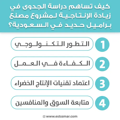 تساعد دراسة الجدوى في نجاح المشروعات لأنها بمثابة التخطيط الجيد المسبق للمشروعات، وتساعد دراسة الجدوى في زيادة إنتاجية مشروع مصنع براميل حديد في السعودية بحيث يتم تصنيع البراميل الحديدية بطريقة فعالة وأمنة ومستدامة، وذلك من خلال: