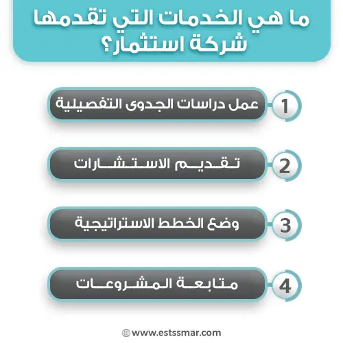 - تقوم شركة استثمار بتقديم الاستشارات المالية والاستشارات الاقتصادية ليوم التأسيس لشركة دراسة الجدوى لتحديد مدى تناسب رأس مال المشروع مع فكرة المشروع ولتحديد الأرباح المتوقعة ومدى استجابة المشروع واستمراريته وتحقيقه للنتائج، أيضًا يتم معرفة الجهات المناسبة ومدى حاجة المشروع للتمويل إذا كانت قروض من البنوك أو من المستثمرين أصحاب الشركات الكبرى أو الاستثمار الأجنبي والشركات العالمية.