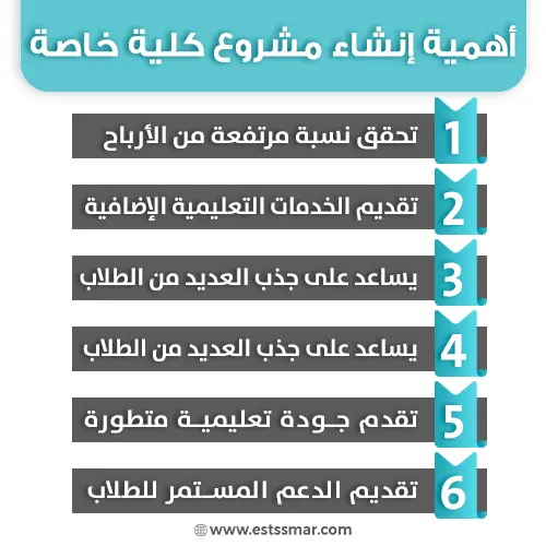 - إنشاء كلية خاصة تعتبر من المشروعات الهامة التي تحتاج إلى وجود دراسة جدوى مشروع كلية خاصة على يد شركة معتمدة وموثوقة لتغطية المشروع وإكمال الخطوات حتى الوصول إلى الخطط الاستراتيجية.